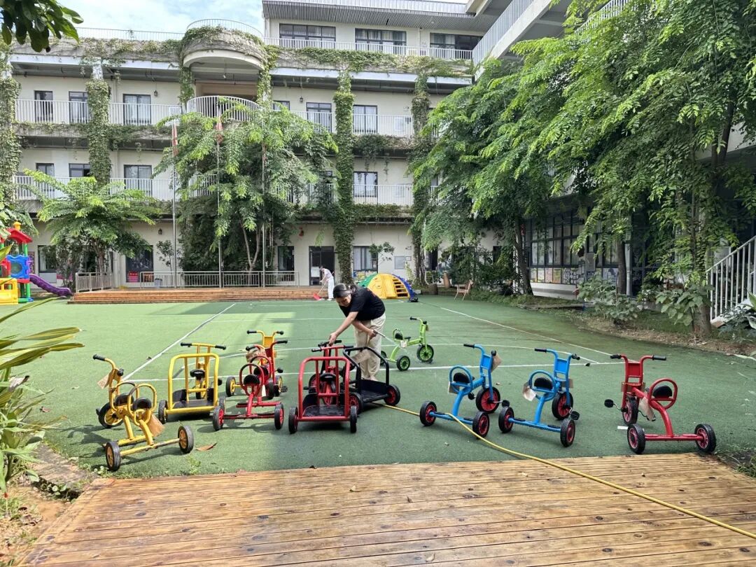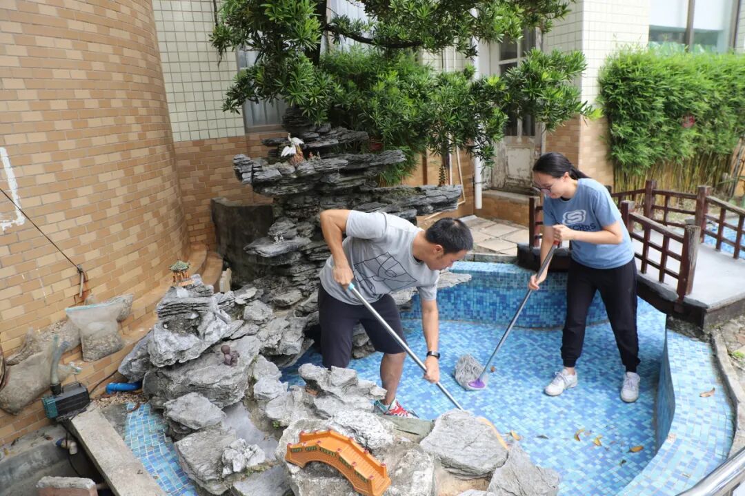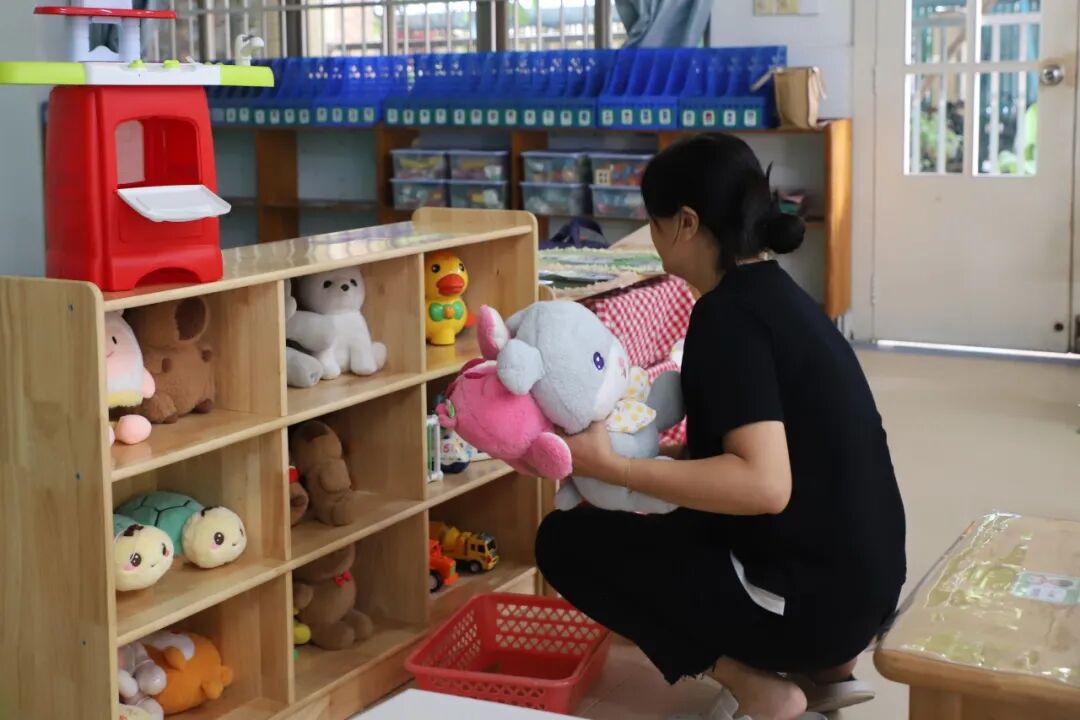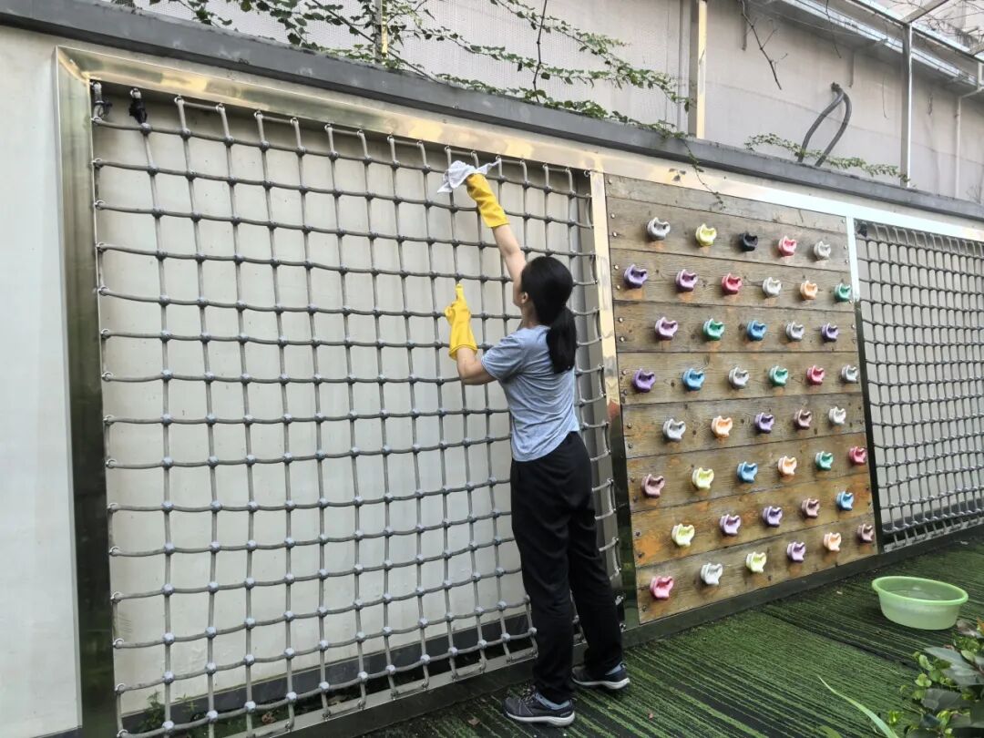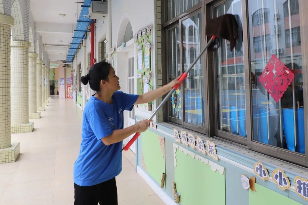 从户外游戏的器材到教室的角落,老师们检查着每一个区域,认真打扫、仔细清洗,做到不留死角、不留盲区。
