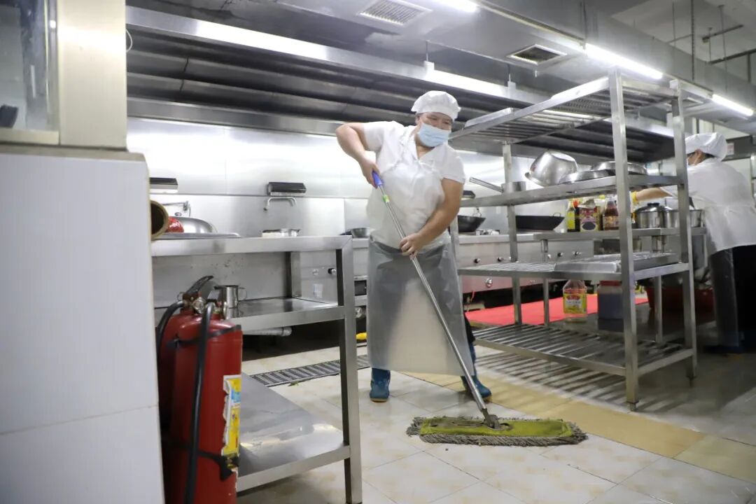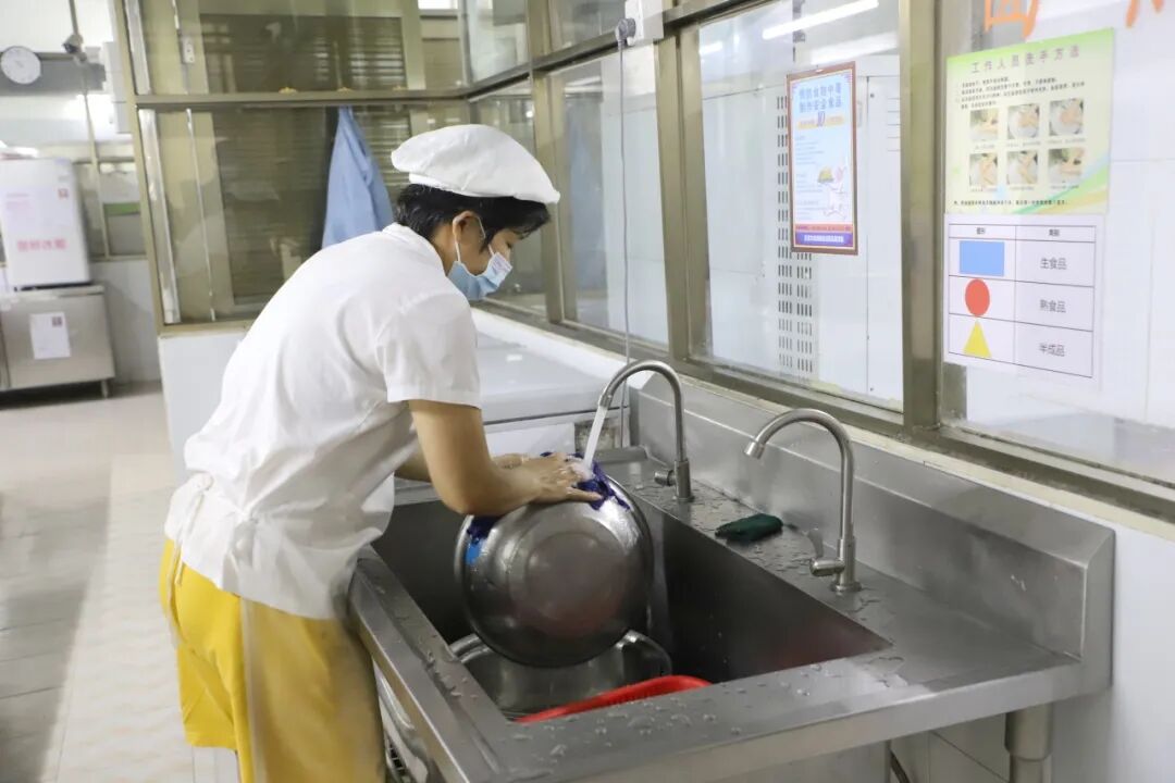 食堂的工作人员对厨房厨具、设备、地面等进行彻底清洗,确保给孩子们提供一个安全、卫生的饮食环境。
