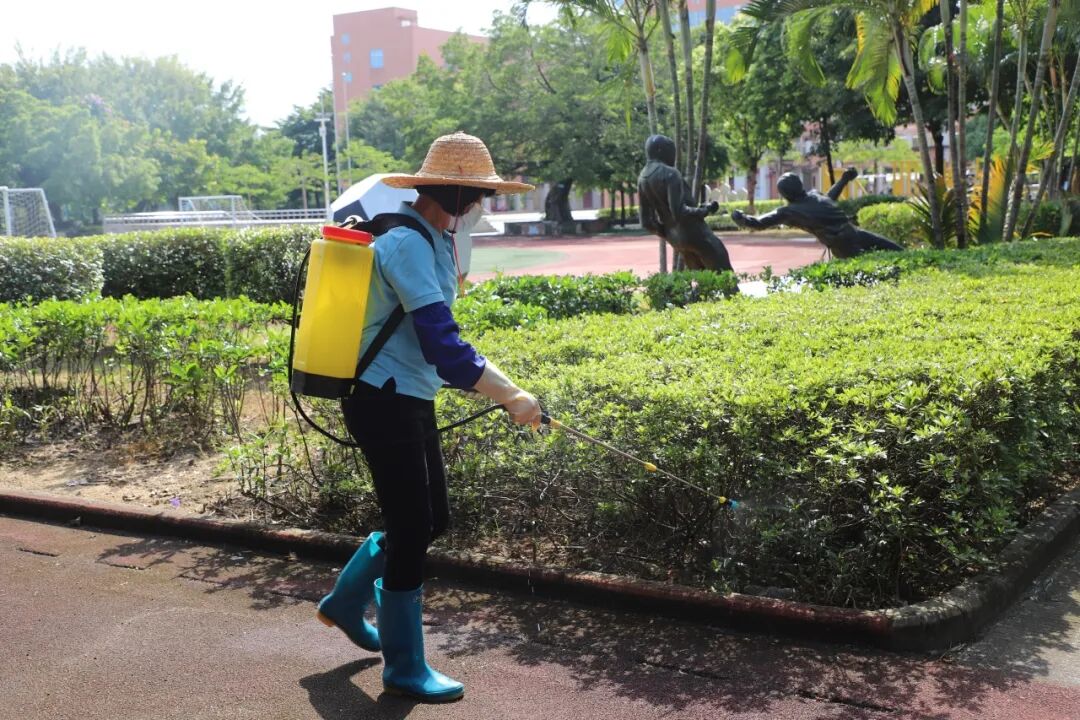 消杀人员在校园的各个角落喷洒药物,重点对校园绿化带、下水道、积水容器等区域进行彻底清理,不放过任何一个可能孳生蚊虫的地方。