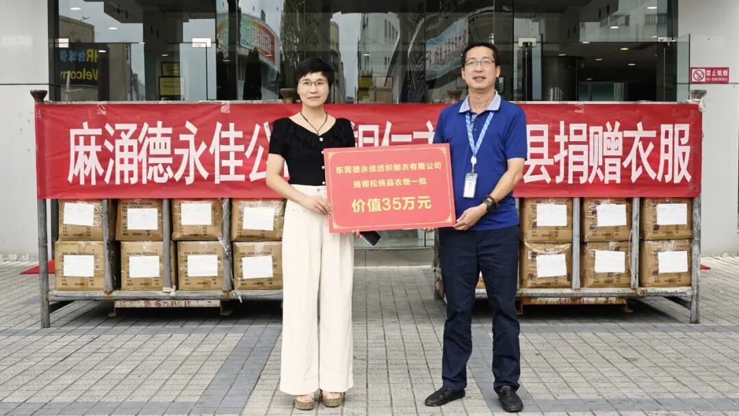 在本次捐赠活动中,三家企业结合自身业务提供物资支持。据了解,东莞德永佳纺织制衣有限公司捐赠了一批价值35万元的衣服,东莞超盈纺织有限公司捐赠了一批价值20万元的衣服,东莞司贸文教赠品有限公司捐赠了一批价值3.3万元的文具。