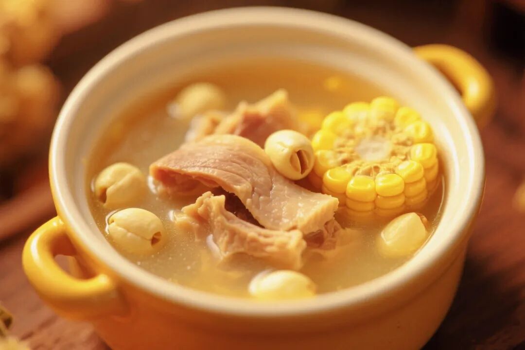 材料:玉米3条、白果50克、猪肚1个、生姜3片