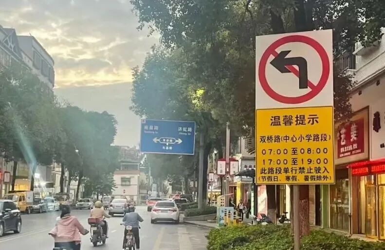 注意:北滘中心小学周边北滘镇双桥路(东基路口至南源路口段)恢复单行,单向通行交通管制时间为上学日的7:00-8:00、17:00-19:00 。