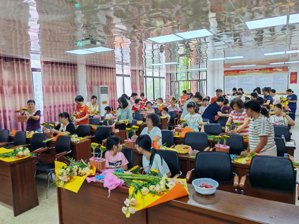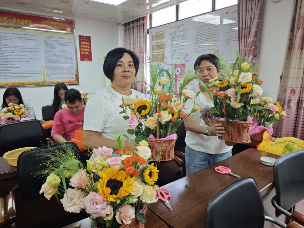 村民听得认真、学得投入,纷纷动手实践。有的夫妻搭档,一人修剪花枝,一人调整造型,眼神交流间温情流露;有的边插花边分享生活趣事,现场欢声笑语不断。志愿者穿梭其间,协助分发材料、提供帮助。原本普通的鲜花,在大家的巧手制作下,渐渐变成一个个错落有致、别具匠心的花篮。捧着亲手完成的作品,每个人脸上都洋溢着幸福的笑容。