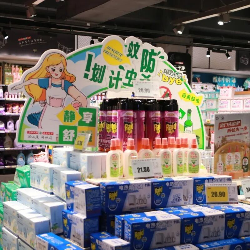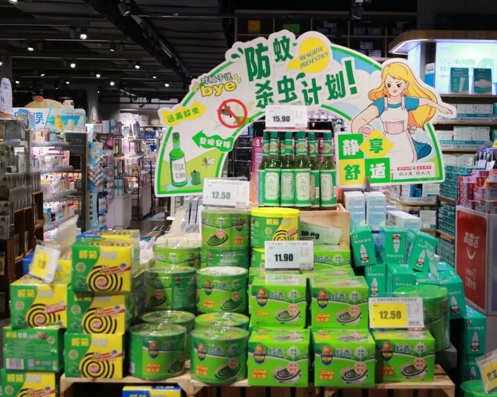 在嘉荣超市(麻涌店)的生活用品区,一个精心布置的“防蚊产品专区”格外醒目。蚊香、驱蚊液、电热蚊香液……十余种防蚊灭蚊产品整齐陈列,品种丰富多样,方便顾客“一站式”选购。