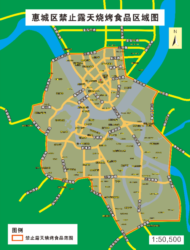 惠城区禁止露天烧烤食品区域:北起新寮北路与三环北路交界处,沿三环北路、第三东江大桥、三环西路;西至三环西路与新联路交界处,沿新联路、红花湖路、金榜路、三环南路、下马庄路、演达大道;南至演达大道与四环南路交界处,沿四环南路、惠澳大道、三环东路;东至三环东路与惠州大道交接处辅道,沿惠州大道、东江一号路、人民路、隆生大桥至新寮路,沿新寮路、新寮北路至与三环北路交界处的区域内(详见惠城区禁止露天烧烤食品区域图)。上述区域内全面禁止露天烧烤食品,任何单位和个人不得在上述区域内露天烧烤食品或者为露天烧烤食品提供场地。禁止时段为全时段。