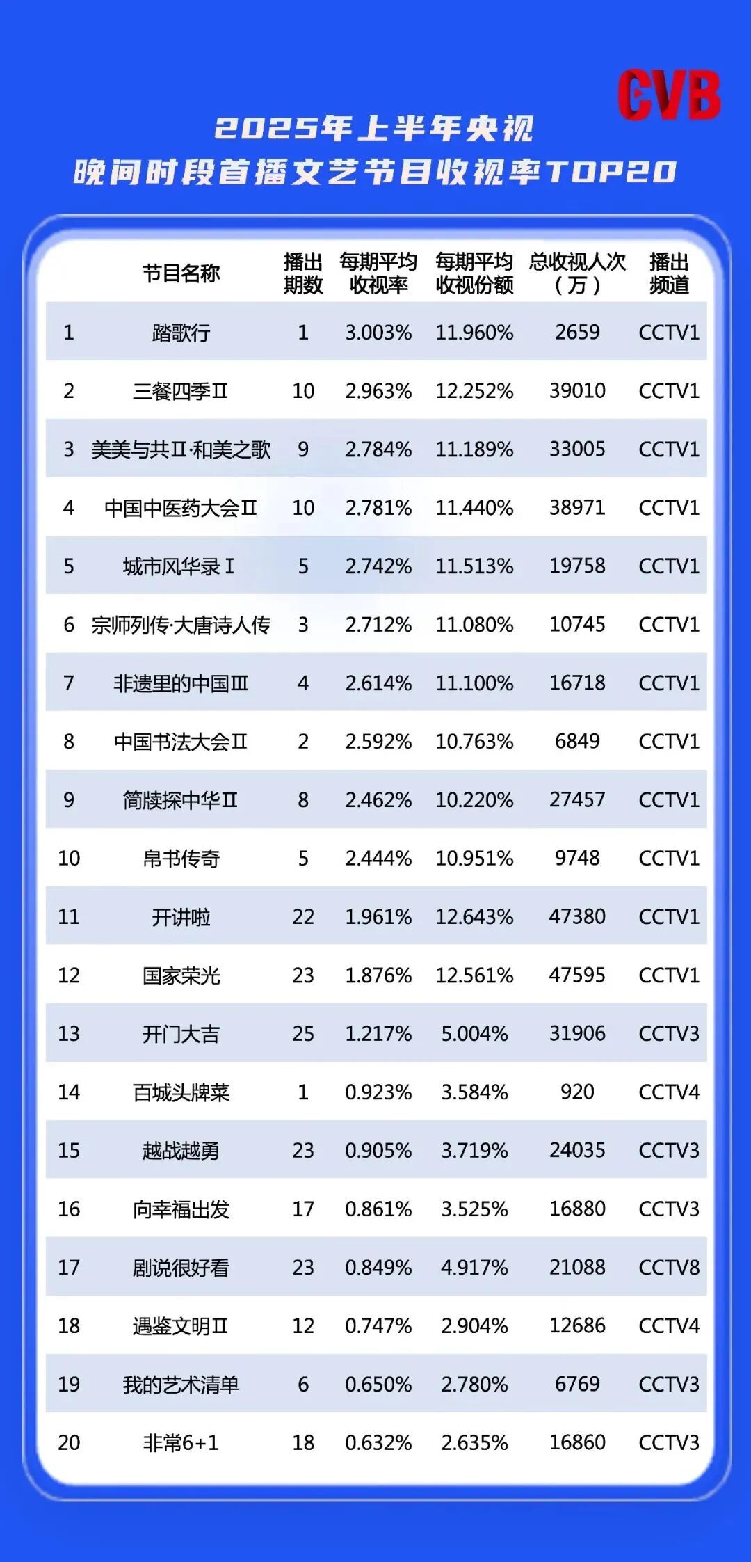综合来看,文化综艺凭借其卓越的传播表现,已成为推动传统文化“破圈”的关键力量。在电视端,据中国视听大数据(CVB)统计,2025年上半年新播文艺节目数量攀升,文化类节目收视表现亮眼,其中,以总台央视综合频道的文化综艺集群收视表现最为强劲,持续占据晚间黄金时段收视的高地。其中,既有《非遗里的中国》《三餐四季》《中国医药大会》等连续播出几季依然热度不减的“综N代”,也有《帛书传奇》《中华考工记》《城市风华录》《踏歌行》等新播精品,凭借其跨代际的吸引力,形成了“全家共赏”的破圈现象。