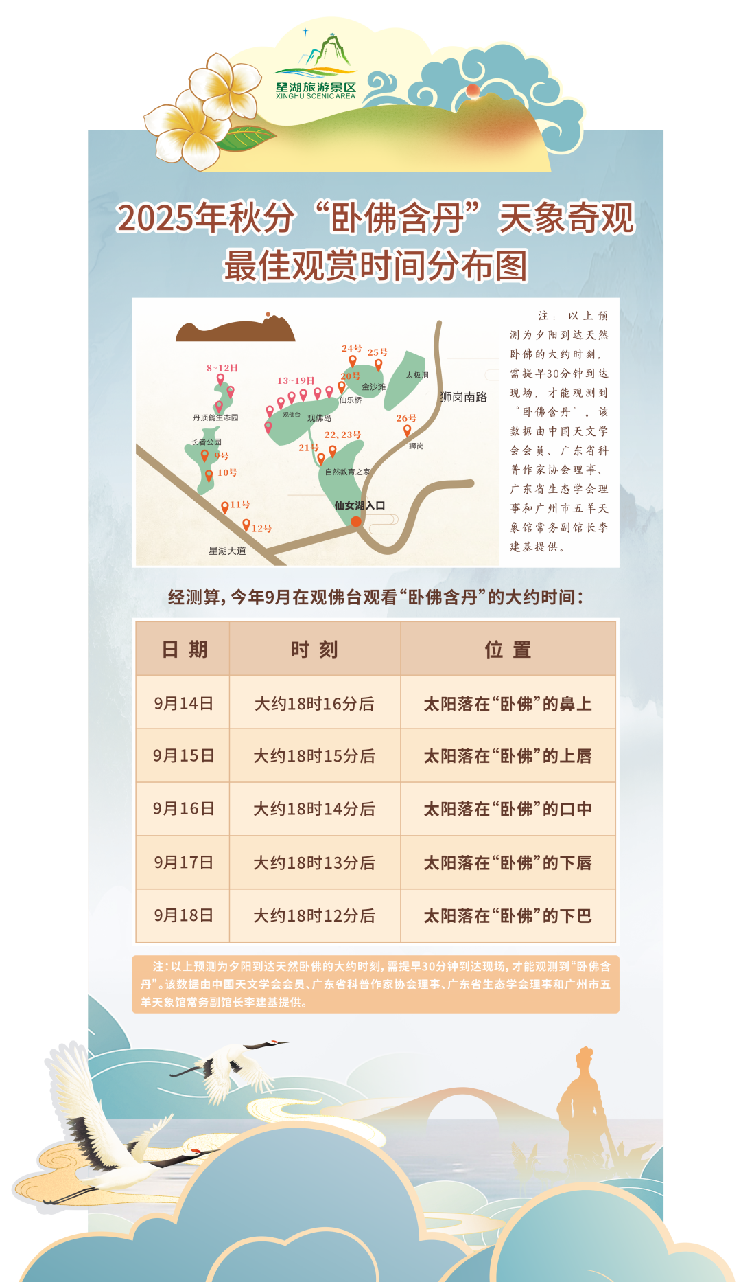 星湖国家湿地公园约位于北纬23°05’,恰好位于北回归线带上,造就了这个集天时、地利、人和的好地方,也是集聚日、月、星辰的神奇之地,汇聚了夏至“立竿无影”、冬至“月亮垂照”、春分、秋分“卧佛含丹”四大节气的天象奇观。