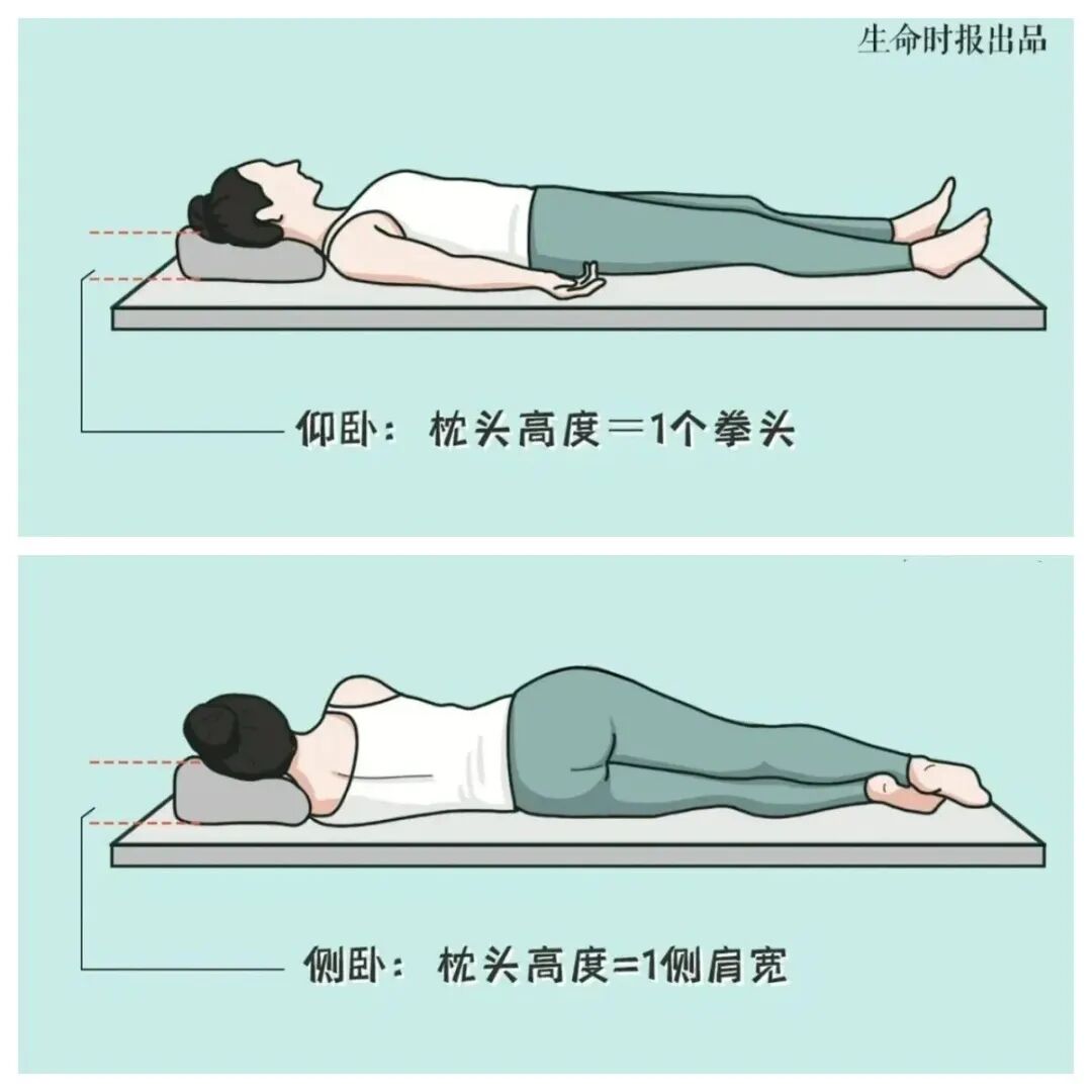 华中科技大学附属协和医院关节外科副主任医师张波表示,睡姿一定程度上会影响枕头高度的选择。一般习惯仰睡,枕头高度应该相当于一拳的高度;习惯侧睡,枕头高度可大约等于一侧肩宽的高度。