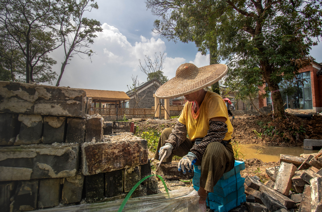 ▲工人正清理着从五福村旧房子中拆除的青砖