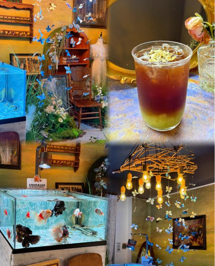 都市边缘藏着一处治愈系咖啡小院,绿意、咖啡香与生活美学在此交织成诗。院内山茶花、月季、绣球花竞相绽放,鹅卵石小径蜿蜒其间,宛如一座生机盎然的迷你植物园;室内,莫奈花园般布景与观赏鱼房相映成趣,兰寿金鱼在水中自在游弋,温顺的小狗、灵动的小猫不时在花影间穿梭,满院皆是温馨惬意。这里更是绝佳拍照圣地——藤蔓花墙、落地窗光影、蝴蝶吊饰、悠游鱼群,每一处角落皆能定格美好。快来体验“观鱼+萌宠+花园”的独特乐趣,在花香与萌态中,邂逅一段治愈的时光。