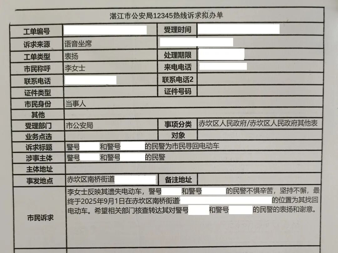 近日,市民李女士通过12345政务服务便民热线平台,向赤坎公安机关致谢,感谢南桥派出所值班民警及时帮助,为其找回用于送外卖的电动车。