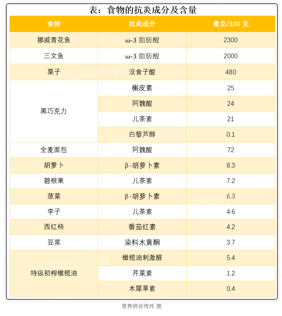 2023年5月国家注册营养师谷传玲根据文献研究,整理出了12种“抗炎王者食物”,供大家日常饮食中参考。