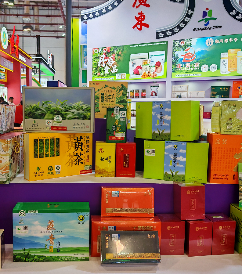 来自我县的德庆县巢顶山茶场、广东肇庆市西江肉桂科技有限公司、德庆县德润茶叶有限公司、德庆县品味食品有限公司携带有绿茶、肉桂产品等参加了展览,其中“龙母贡”系列更是展出了肉桂香牌、贡黄茶、紫淮山米露、广佛手米露等产品,受到了众多客商的青睐。