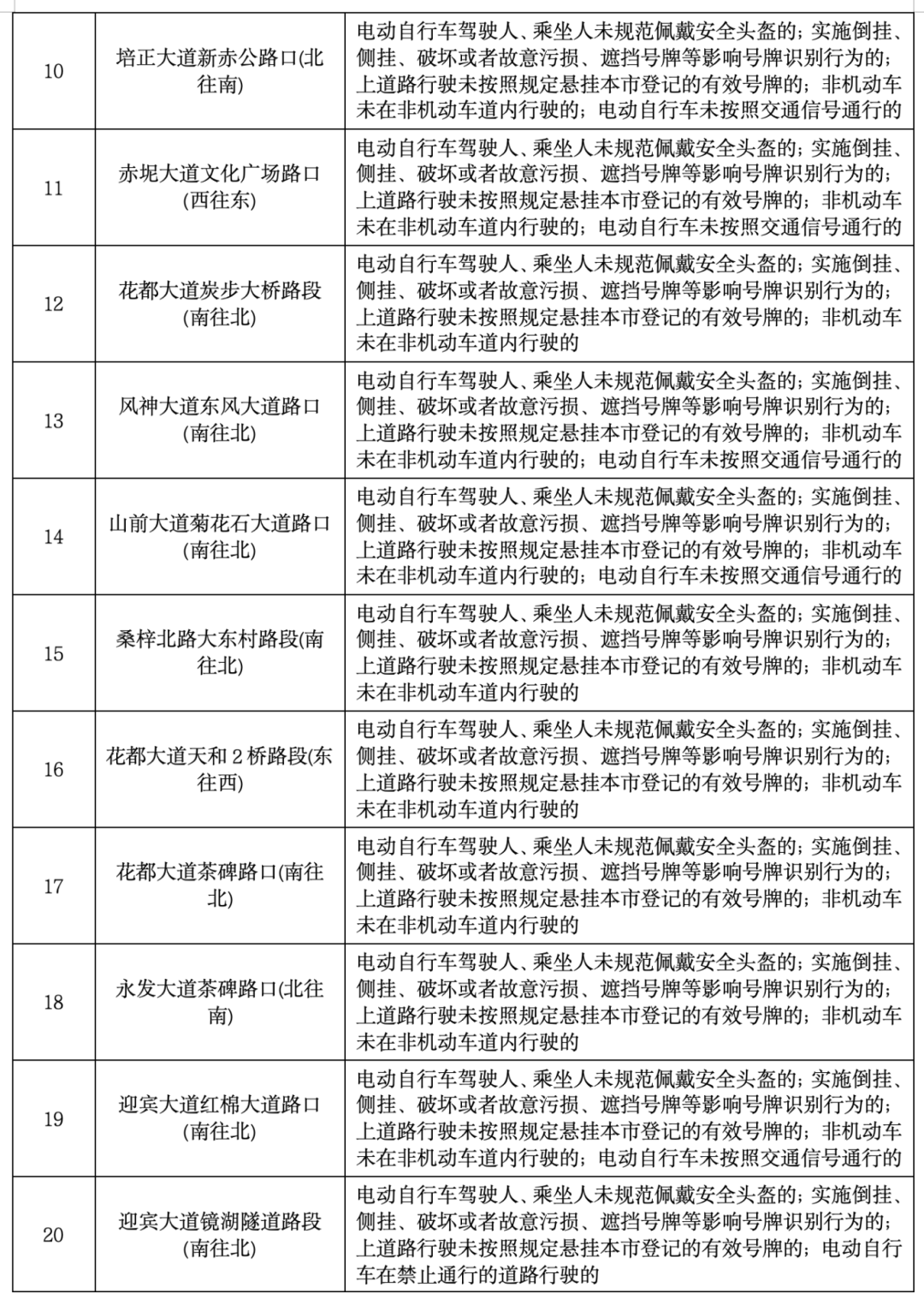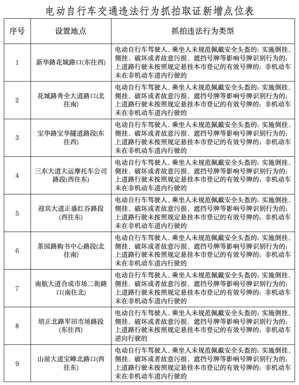 新增点位具体包括新华路花城路口、花都大道等路段。抓拍违法行为包括非机动车未在非机动车道内行驶的、未规范佩戴安全头盔、未按照规定悬挂根式登记的有效号牌等。