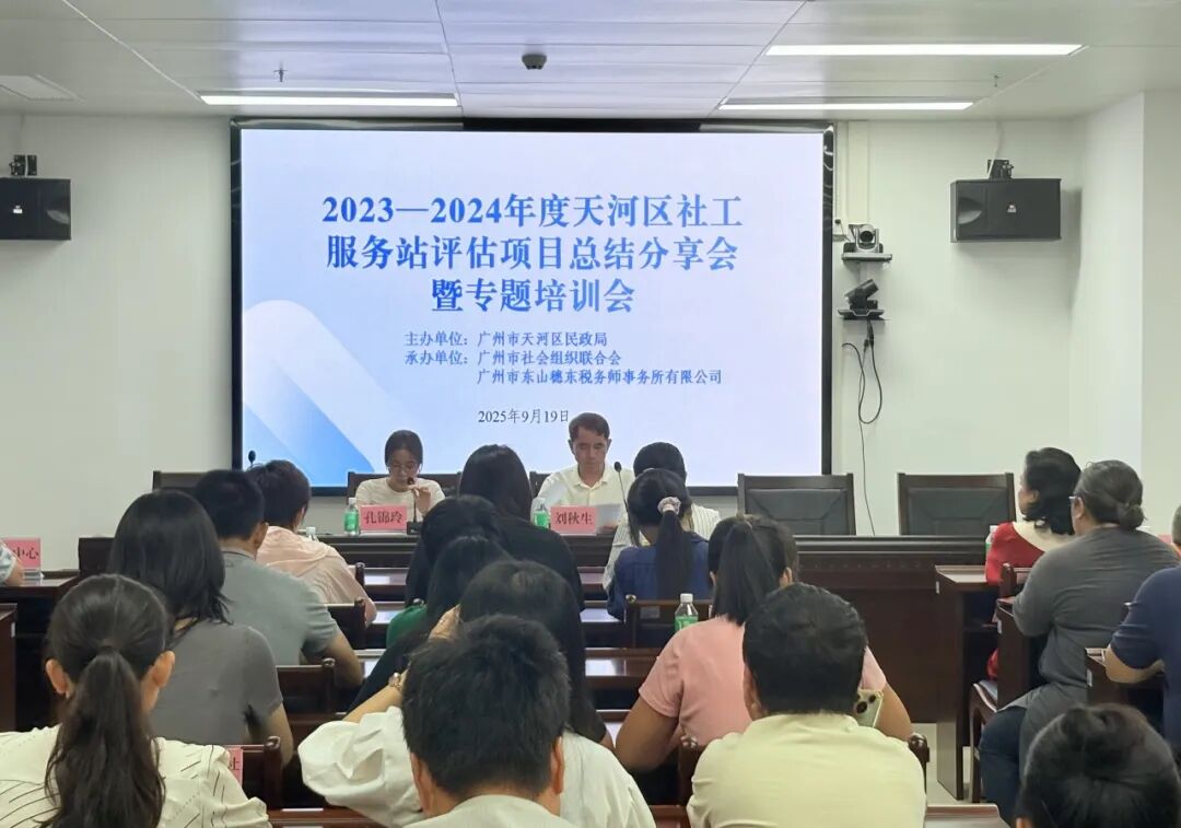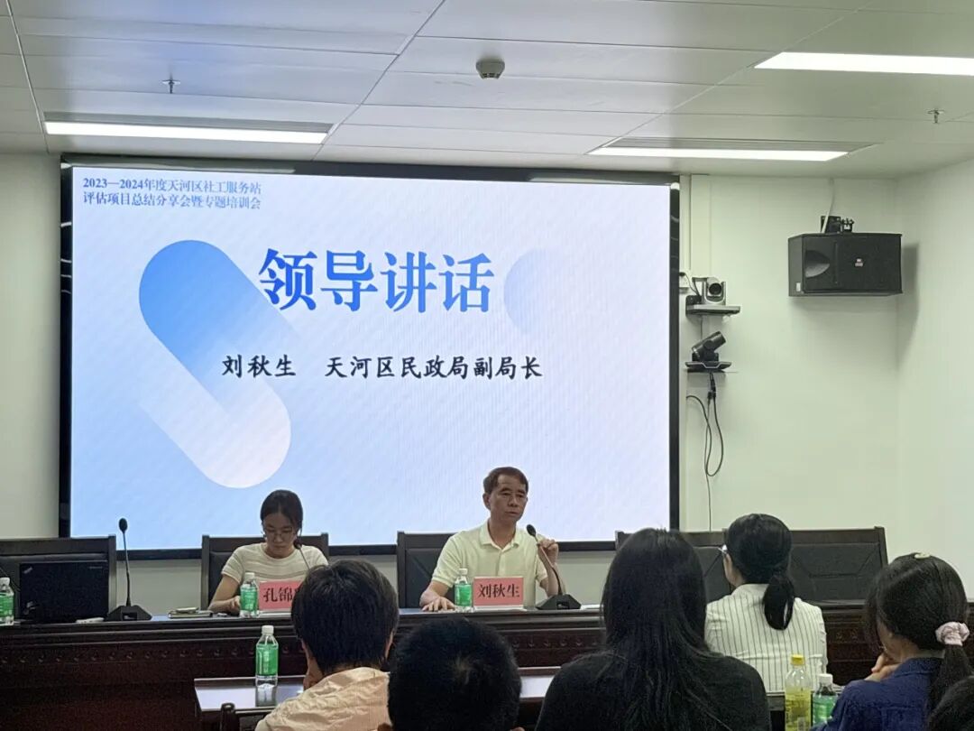 2025年9月19日,由天河区民政局主办、广州市社会组织联合会(以下简称广州社联)承办的2023—2024年度天河区社工服务站评估项目总结分享会暨专题培训会在天河区民政局会议室320举行。天河区民政局副局长刘秋生出席会议并讲话,天河区民政局社区服务中心主任孔锦玲,副主任许丹璇,广州社联项目主管孔俊铿、孙晓卓出席会议。本次培训邀请了广东外语外贸大学社会工作系主任、副教授陈美招和海珠区沙园街“双百工程”社工站副站长刘志超做专题分享。天河区各街道业务科室负责人、各街道“双百工程”社工站承接机构代表和项目负责人等50余人参加培训。