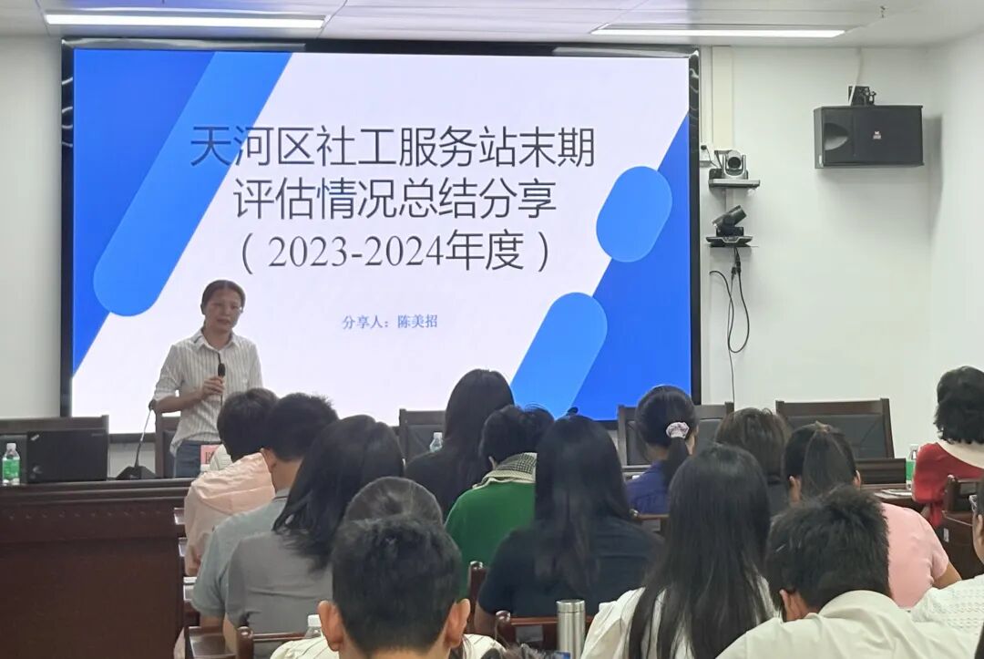 陈美招副教授以“天河区社工站2023—2024年度末期评估情况总结分享”为主题,系统梳理了本年度评估工作中各社工站在运营管理、服务开展、成效产出等方面的整体表现,详细介绍评估背景、原则、人员配置、服务完成情况以及亮点与不足,并结合实际案例对当前社工站转型过程中遇到的挑战与对策进行了深入剖析,为各站点下一步服务规划与专业提升提供了明确指引。