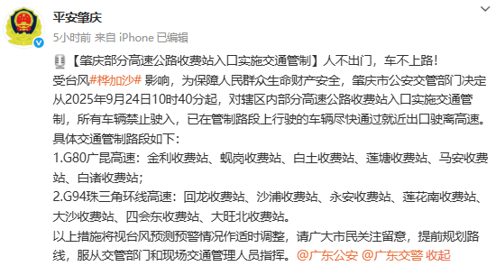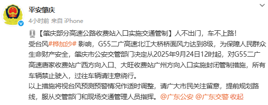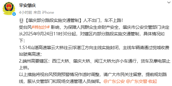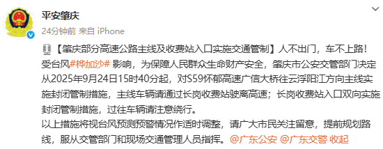 受台风“桦加沙”影响,为保障人民群众生命财产安全,肇庆市公安交管部门决定从2025年9月24日15时40分起,对S59怀郁高速广信大桥往云浮阳江方向主线实施封闭管制措施,主线车辆请通过长岗收费站驶离高速;长岗收费站入口双向实施封闭管制措施,过往车辆请注意绕行。