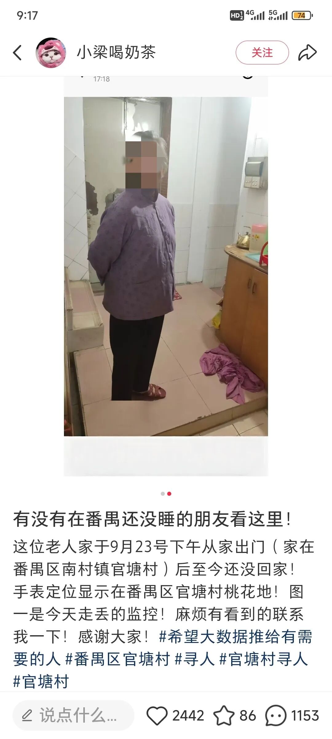 原来,9月23日下午5时,许先生年近80岁的母亲在番禺区南村镇官堂村桃花地走失。走失的第一时间,许先生及其家属、治安队人员立刻在官堂村及员岗村附近寻找,经过一小时寻找无果,家属随即报警。