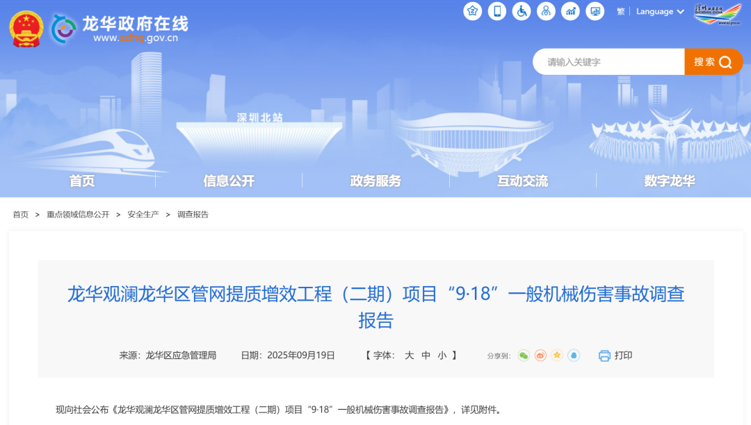 报告显示,2024年9月18日8时25分许,观澜街道龙华区管网提质增效工程(二期)项目工地发生一起一般机械伤害事故,造成1人死亡,直接经济损失约128万元。