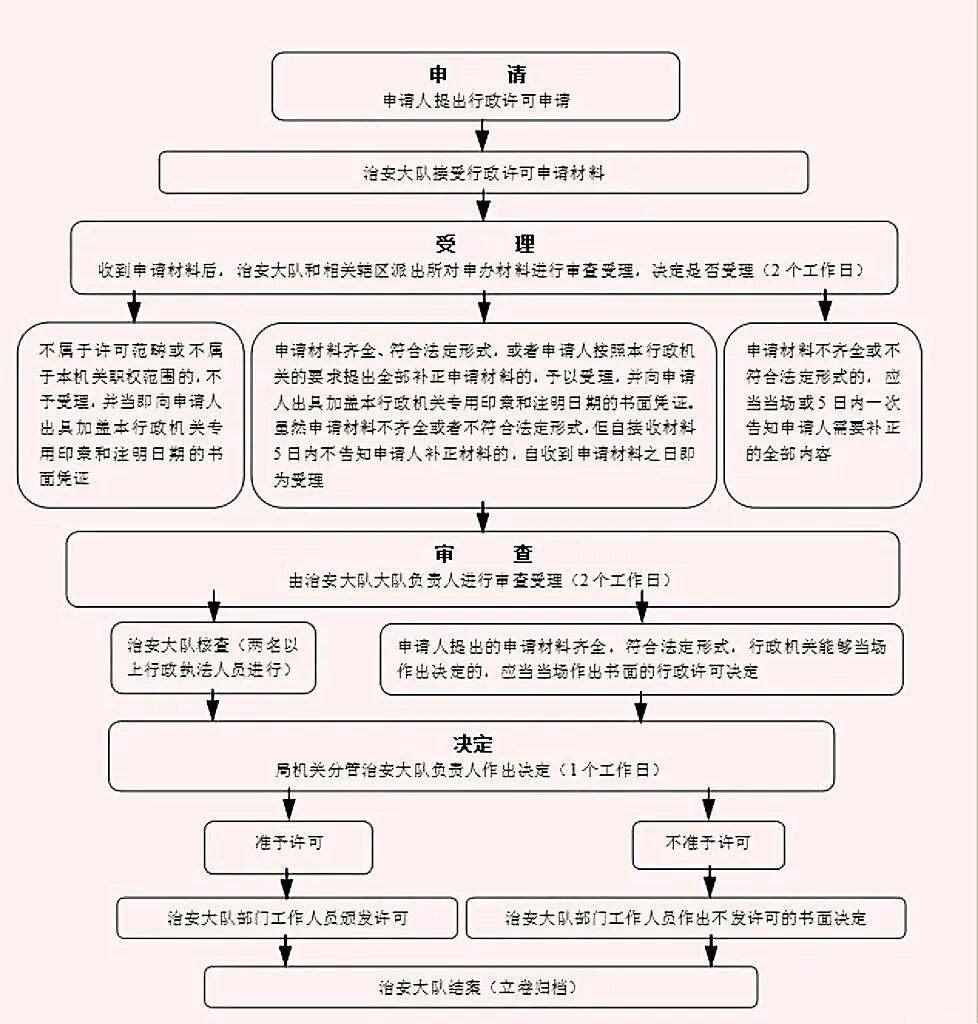以上材料完善之后,需到属地公安机关治安管理大队办理该业务。