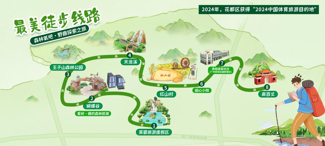 花都区广清穿越绿美观花骑行道入选“2024年中国骑行地图精品骑行路线”,全长124公里,穿行花都健身步道段、花漾年华乡村振兴示范带,可欣赏游玩传统古村落、九龙湖度假区、中国最美乡村红山村、王子山森林公园、芙蓉嶂度假区、马岭观花植物园、千亩桃园,感受花都源远流长的历史人文之美、绿水青山的自然生态之美、独具风韵的地方民俗之美,最终抵达清远长隆国际旅游度假区,穿越广清,游历两城自然山水风光,宛若穿行在一幅壮丽和谐的山水人文画卷,是一条体验感极其丰富的骑行游玩线路。