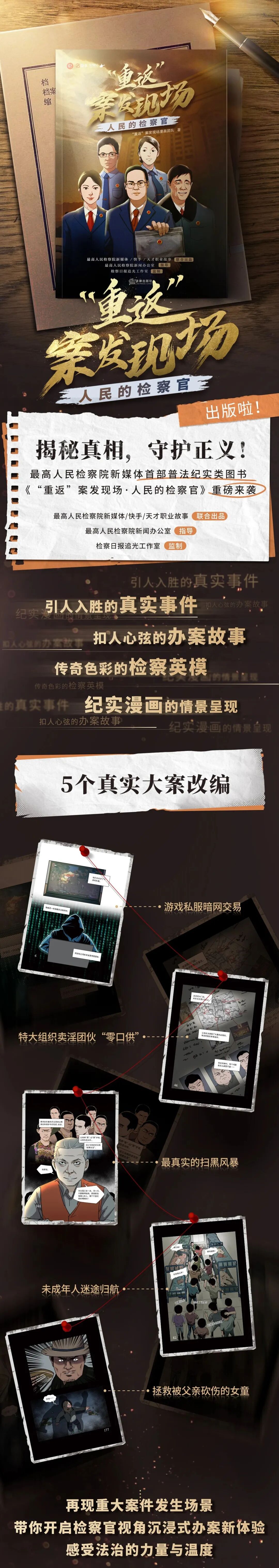 《“重返”案发现场·人民的检察官》聚焦新时代检察英模的真实办案故事,分别以党的二十大代表、上海市浦东新区人民检察院三级高级检察官施净岚,重庆市大渡口区人民检察院副检察长梅玫,江苏省苏州工业园区人民检察院党组书记、检察长王勇,海南省人民检察院检察部四级高级检察官徐贺,内蒙古包头市达茂联合旗人民检察院检察官潘志荣为原型,将永恒之塔游戏私服侵权案、海南“土皇帝”黄鸿发特大黑恶组织犯罪案等漫画形式进行创意改编,融合“纪实普法二次元剧情”元素于一体,将正能量内容进行年轻化表达。