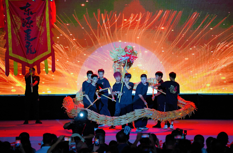 当天19时30分,伴随着喧天的锣鼓与呐喊,开场节目《追龙少年》由上莞少年香火龙队手擎新制作的“秀气版”香火龙登场,联袂河源理工学校学生组成的猫头狮队,瞬间点燃现场气氛,传统文化与青春活力碰撞出别样火花,引得掌声雷动。