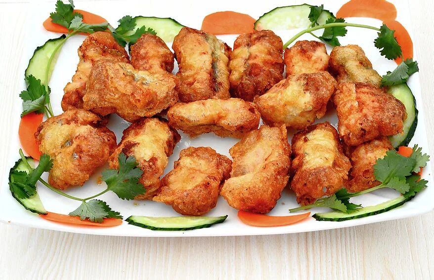 刚出锅的炸鳗鱼色泽金黄,香气四溢