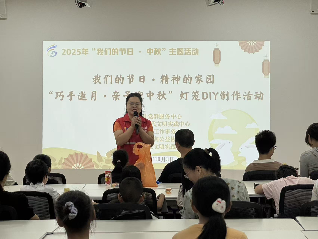 志愿者的身影不止于此。近日,“巧手邀月·亲子迎中秋”灯笼DIY制作活动在县新时代文明实践中心举办。县方向公益协会的志愿者们讲解了中秋的由来、习俗等内容,在互动游戏中为亲子家庭带来欢乐。