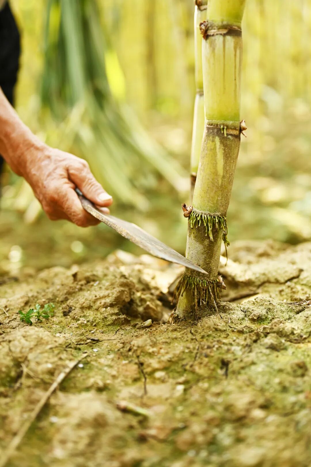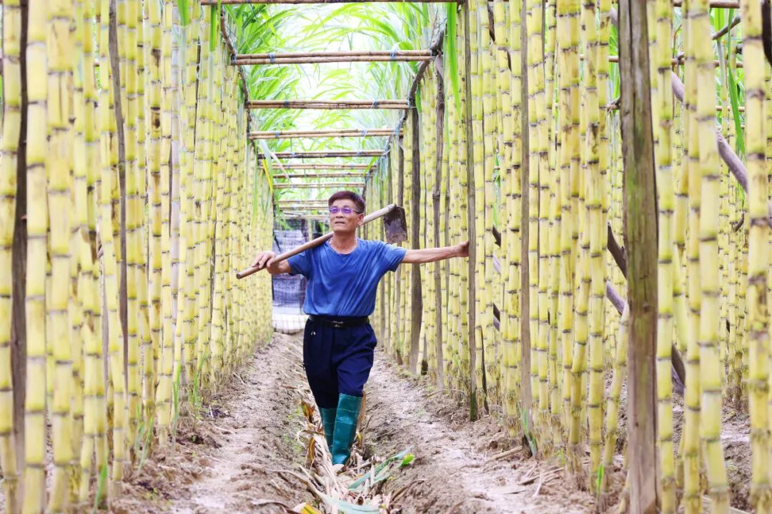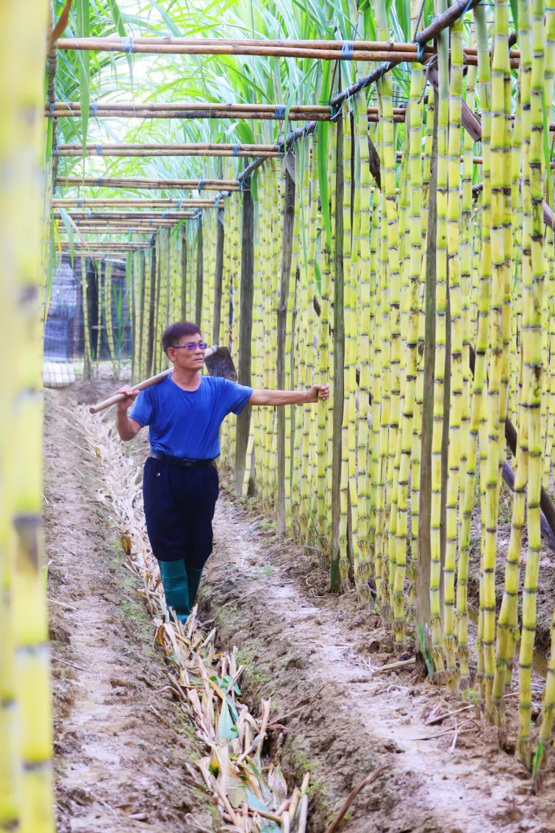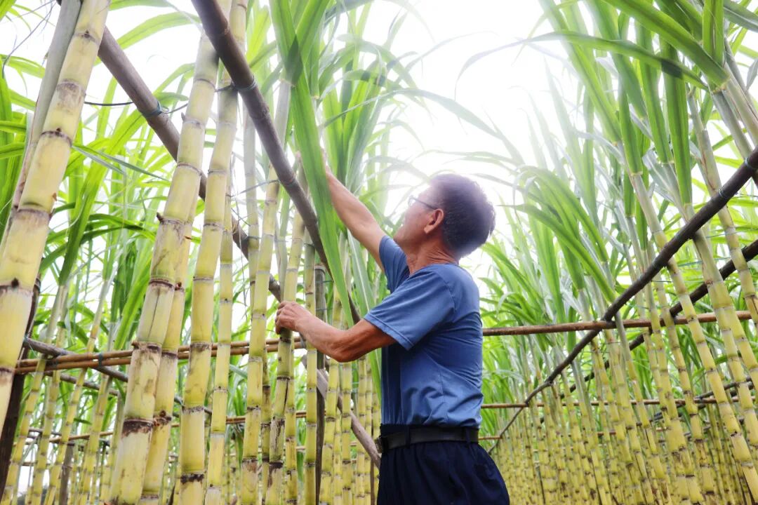 在这片充满生机的蔗田里,年过七旬的蔗农陈权正穿梭其间,时而俯身检查蔗茎的成熟度,时而熟练地剐除枯叶,让甘蔗更好地通风透光,促进蔗茎粗壮生长。他手脚麻利,眼角眉梢都带着笑意。