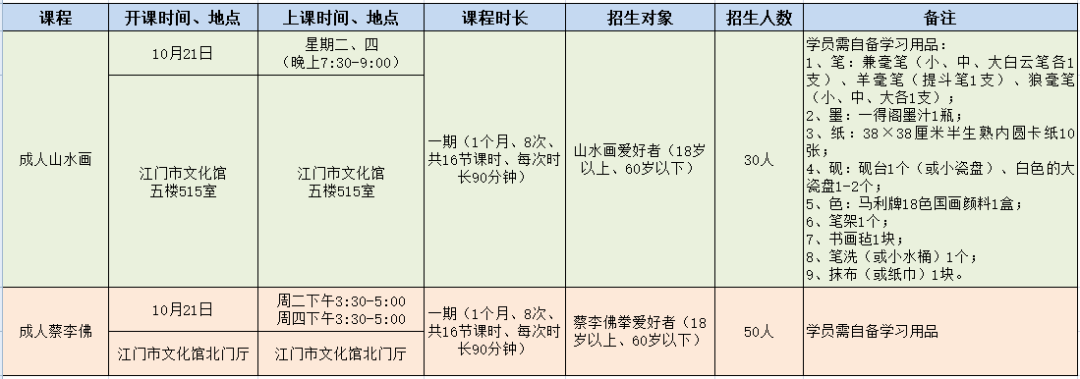 3、报名通道即时开放,报名成功的学员名单将10月17日(星期五)在“广东江门市文化馆”微信公众号中公布,不另行通知,请学员注意查询,并按时到指定地点上课。