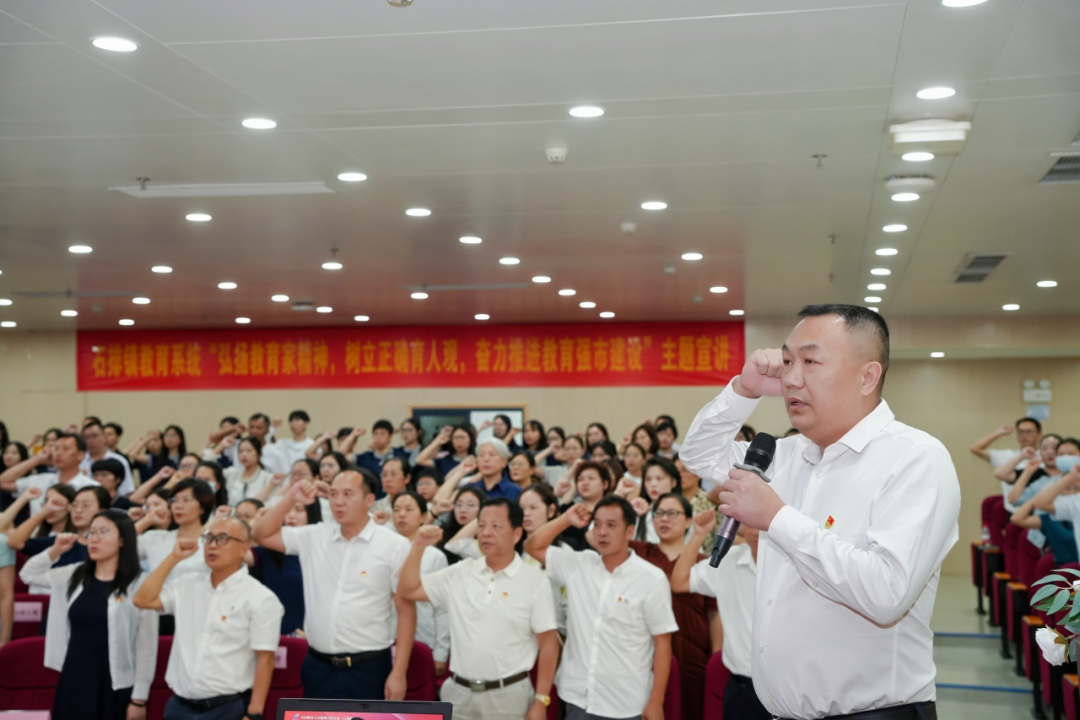宣讲结束后,活动进入集体宣誓环节。石排镇教育管理中心主任曾云峰领誓,全体参会教师起立举拳,以铿锵有力的誓言,彰显恪守师德准则、潜心教书育人的坚定决心,将活动氛围推向高潮。