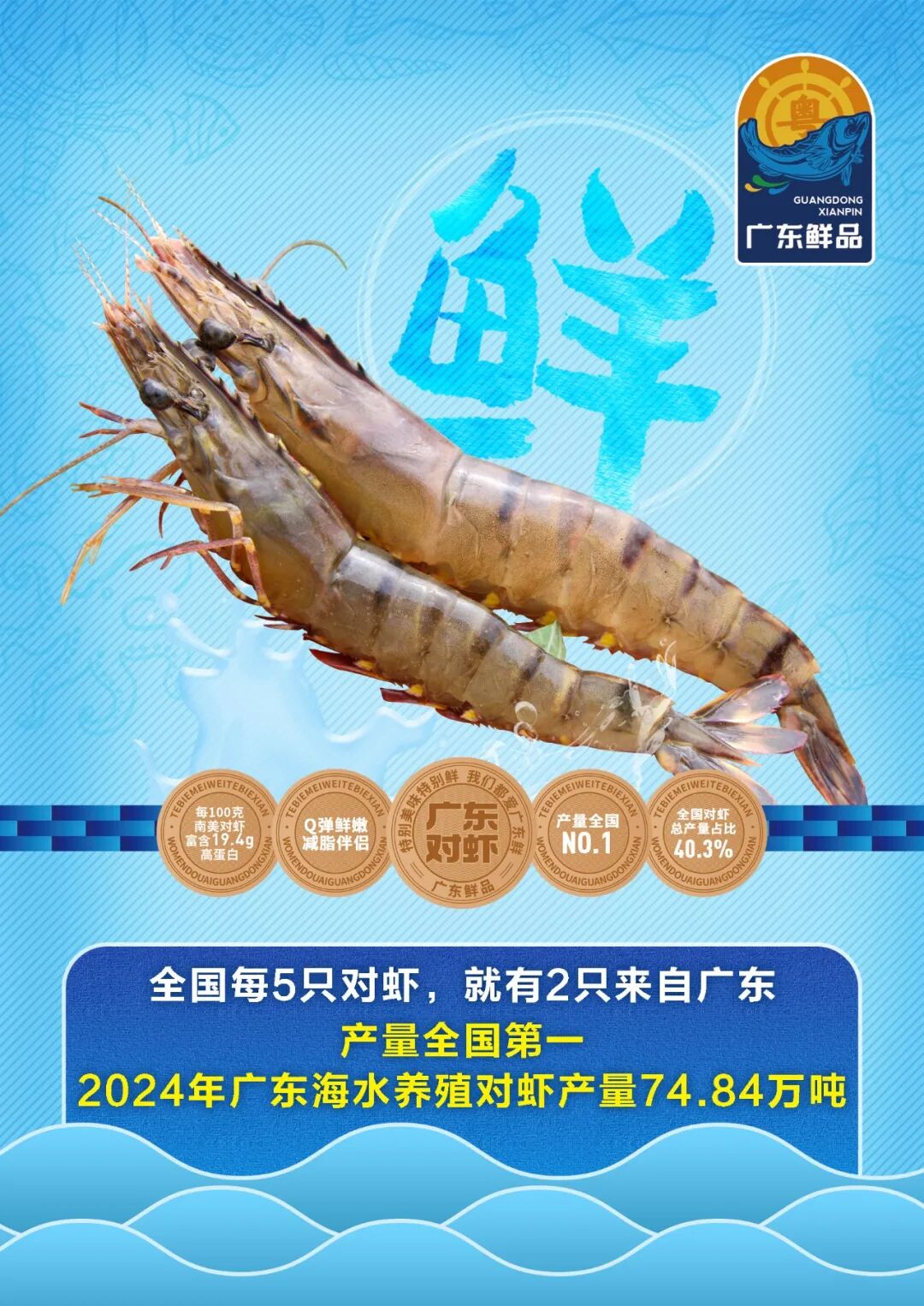 广东对虾养殖面积、种苗及成品产量长期居全国首位。2023年,南美白对虾产量占全国41.0%,斑节对虾占69.3%,虾苗产量5967亿尾领跑;2024年广东海水养殖对虾产量74.84万吨,占全国40.3%,南美白对虾产量61.2万吨,双双稳居全国第一,“粤字号”对虾成中国海产亮眼名片。