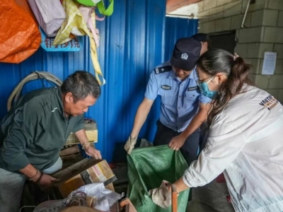 记者在惠民南路60号运豪苑公寓看到,街道和社区工作人员正与顶层居民进行沟通,耐心解释天台堆积杂物的危害,并动员他们自行清理仍有使用价值的物品。随后,区公安、城管、消防、应急等部门执法人员手持铁铲、扫把、编织袋等工具进入天台,逐一清理堆积物品,铲除青苔杂草,重点对花盆托盘、废弃桶罐等易积水容器进行倾倒与移除,并在居民配合下依法有序清理天台农作物、清运家禽至指定地点进行规范处理。
