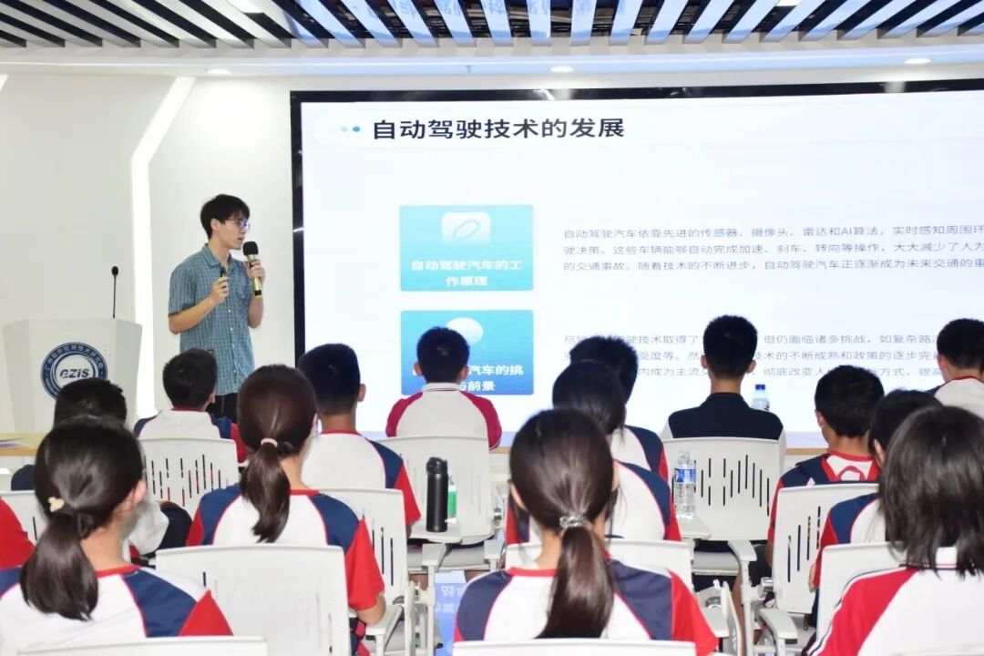活动伊始,广州软件院讲师围绕“AI赋能未来交通,智能科技与城市出行变革”进行专业讲解,结合政策背景与实践案例,系统性地阐释了人工智能如何深度赋能交通领域,内容覆盖智能交通系统的构建、自动驾驶技术的核心原理、车路协同的前沿实践以及绿色出行的未来图景。讲座将复杂的技术知识转化为通俗易懂的语言,不仅深化了学生们对智慧城市的理解,也激发了他们对于科技改变生活的无限想象。
