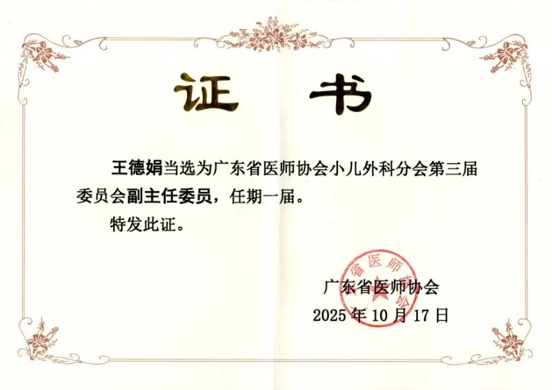 中山六院小儿外科王德娟当选广东省医师协会小儿外科分会第三届委员会副主任委员