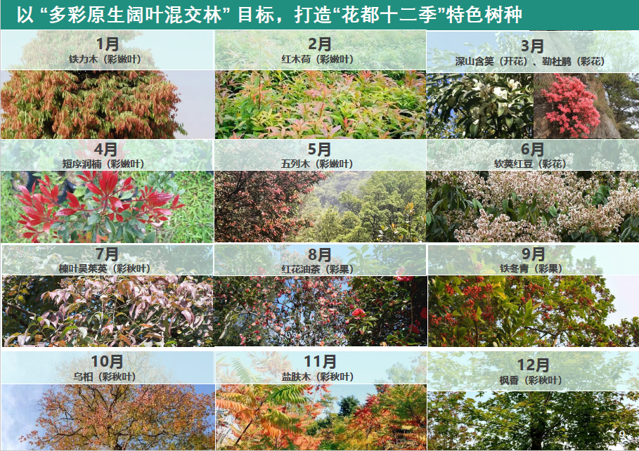 以规划为依托,一幅“四季皆景”的原生森林山水画卷正徐徐展开。春季以荷木、五列木、润楠属等彩叶及软荚红豆、千年桐为主;夏季林冠层浓郁翠绿、及至秋冬,铁冬青、大头茶纷纷披上彩叶、挂满彩果,与落羽杉的赭红、枫香的斑斓交织辉映,重现原生多样、季相分明的森林风貌。