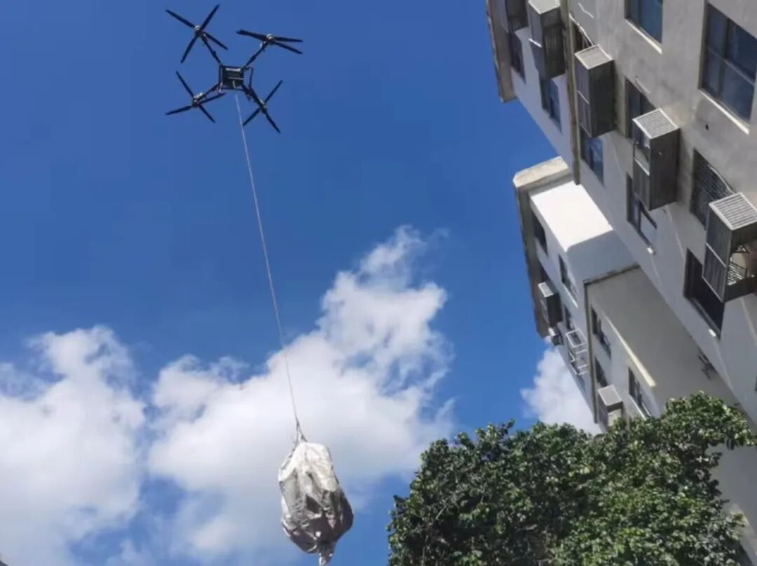 针对大件垃圾搬运难题,网格员创新采用“人工+无人机”模式。体积较大的垃圾通过无人机吊运高效转运,对于不便通过无人机吊运的零散垃圾,网格员们手提肩扛,一趟趟安全搬下楼。
