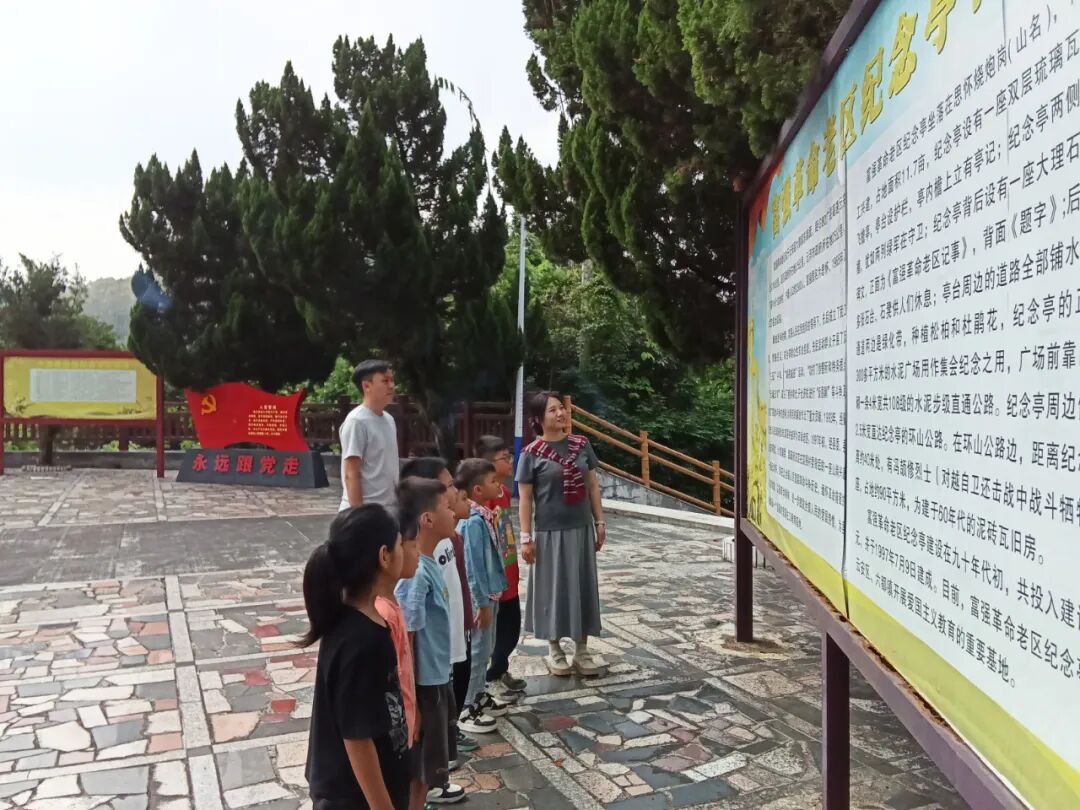沿着村道前行,来到烧炮岗上的富强革命老区纪念亭,松柏常青、古榕蔽日,富强小学的老师正带着学生们驻足聆听——这里曾是解放战争时期的“红色战场”,富强人民在党组织领导下,成立武工队、常备民兵、农会等组织,开展反“三征”“减税减息”“反‘围剿’”斗争,为粤西解放贡献了重要力量。