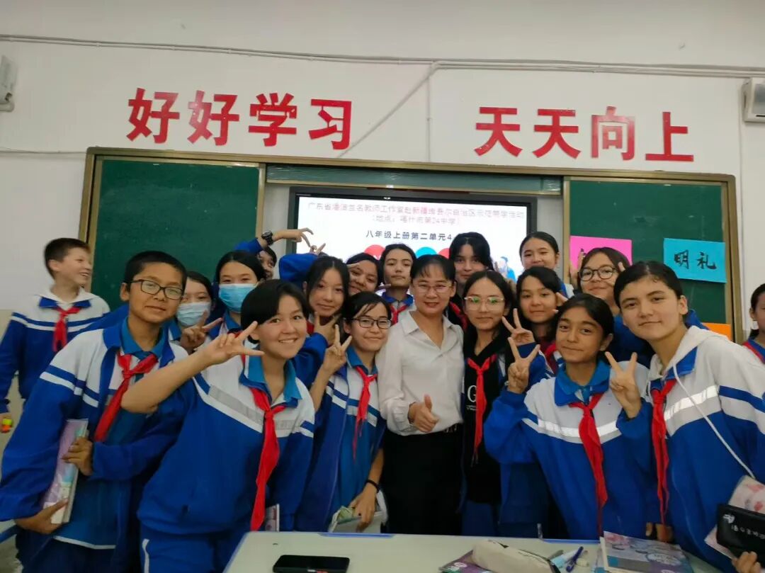 2023年,作为广东省中小学名教师工作室主持人,她把广东先进教学经验带到喀什、疏勒等地,还以人民教育出版社教材培训专家身份,推广普通话、宣讲核心价值观,与当地教师集体备课、跟踪学生学习情况,架起粤新教育交流的“连心桥”。此外,她还参与佛山顺德江义中学西藏班教学,以生动方式传授知识与做人道理,关心学生在粤生活与情感,促进民族团结和谐。