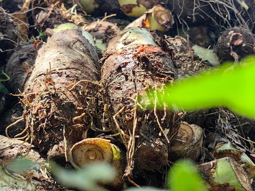 吸收了半年日月精华的炮弹香芋,在泥土里悄悄成熟,田间地头满是“咔嚓咔嚓”的采挖声,像一首欢快的丰收乐曲。脆嫩水绿的茎叶在风中摇曳,而饱满的炮弹芋头就藏在土里,等着你来“寻宝”。