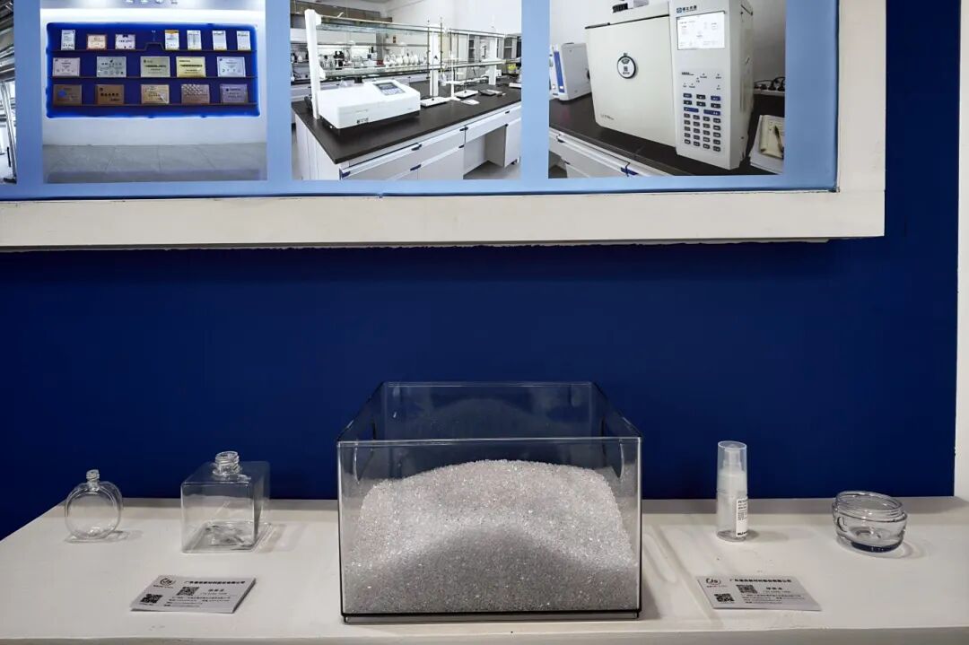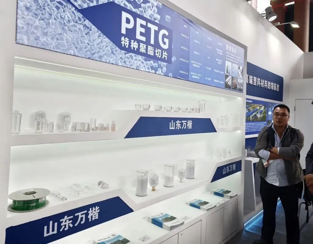 在山东万楷产业投资发展有限公司展位,一系列晶莹剔透的包装瓶格外引人注目。这些产品均采用该公司自主研发的特种聚酯切片PETG材料制成,具有轻质、高透光、抗冲击等优异特性,广泛应用于高端化妆品、医疗包装、消费电子及高性能收缩膜等领域。