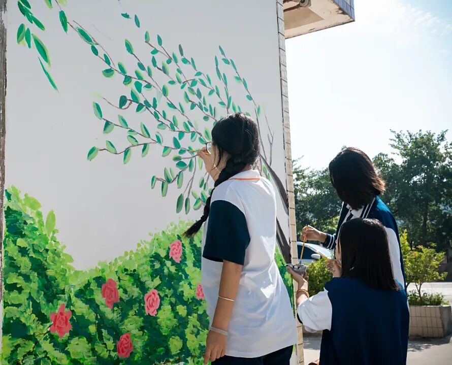创作期间,师生们清晨而出,日暮而归。调色、勾勒、上色……每一个步骤都凝聚着专业与用心。原本斑驳的墙面渐渐“活”了起来——青山绿水映衬着农家小院,丰收图景展现着乡村振兴的喜悦,文明乡风融入生动画面。路过的村民纷纷驻足:“画得真好看,我们村越来越美了!”