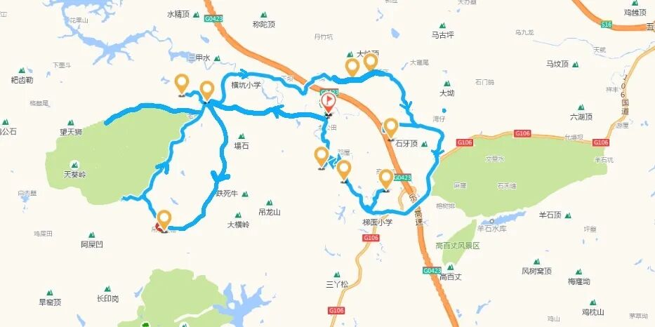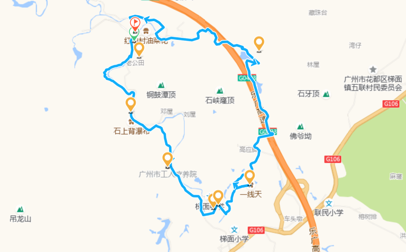 1.醉氧欢乐跑全景线:红山村→红山六社→黄泥潭→西坑栈道→浅草溪谷→蝴蝶谷→百年红锥林→蝶舍→小洞→贵子亭→五联水库→黄竹窿→一线天→工人疗养院→石上背瀑布→红山村(全程约42.92公里)