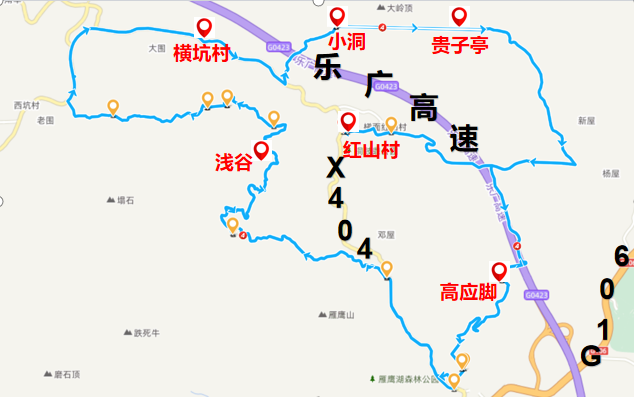 1.森氧骑行挑战线:红山村→五联水库→高应脚→梯面中学→雁鹰路→茅輋路→浅谷→黄泥潭→王子山路→小洞→贵子亭→红联路→红山村(全程约51.1公里,部分路段进出有重复)