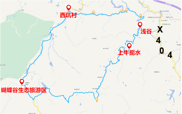 2.森氧骑行休闲线:蝴蝶谷生态旅游区→芙源路→西坑村→黄泥潭→浅谷→上牛扼水→茅輋→吊谷上棚→芙源路→蝴蝶谷生态旅游区(全程约18.8公里)