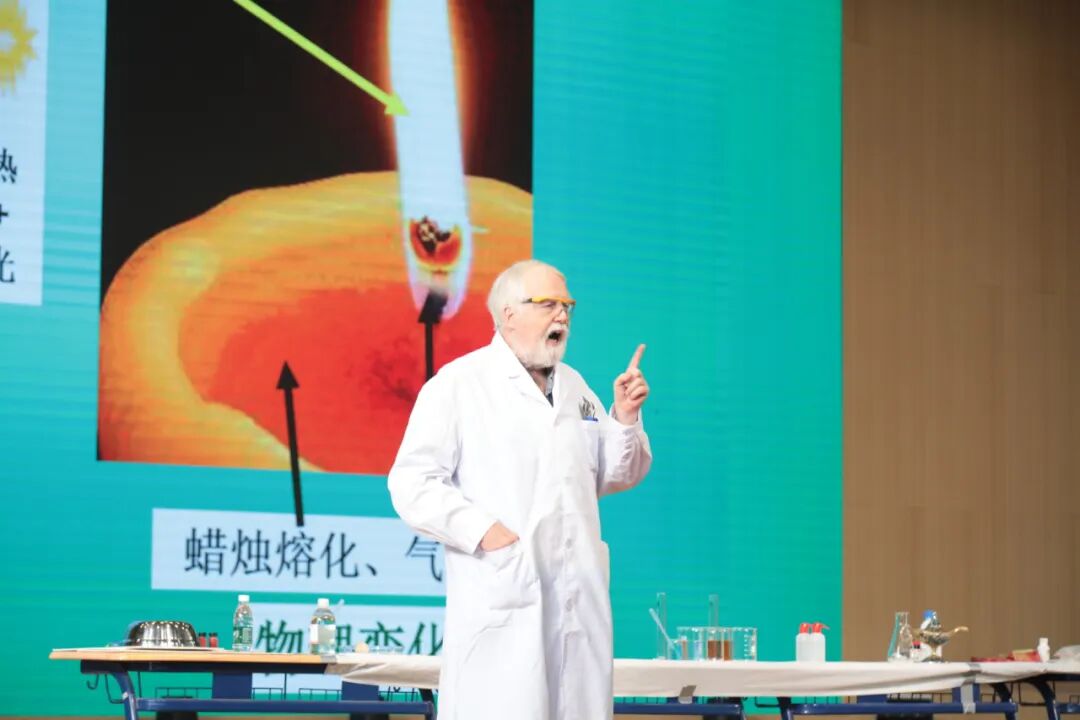 北京化工大学特聘教授、英国籍化学专家戴伟博士借大旺科普行活动这一契机,通过十余个趣味实验,为600余名高一学生及全区中小学校长、科学教师揭开化学反应的奥秘,引领师生共赴一场科学盛宴。