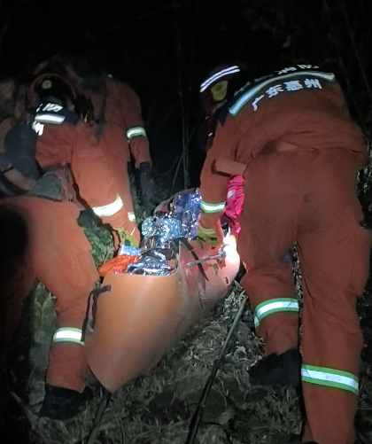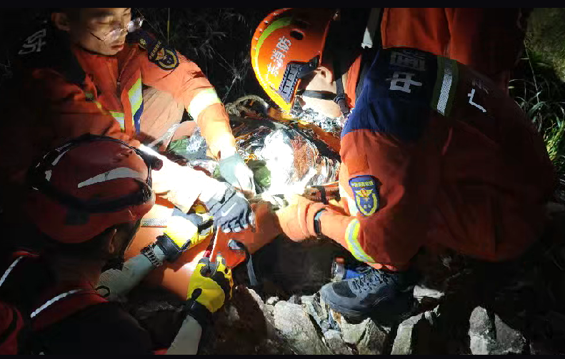 经过 3 小时搜寻,救援人员于当日 20 时 35 分在山谷底部找到伤者。伤者腿部骨折且失血,消防员立即进行急救处理并将其固定在担架上。因夜色昏暗、山路陡峭,救援人员采用绳索牵引方式缓慢转移伤者。23 时 40 分,伤者被转移至主线路,但消防员体力透支,随即请求增援。