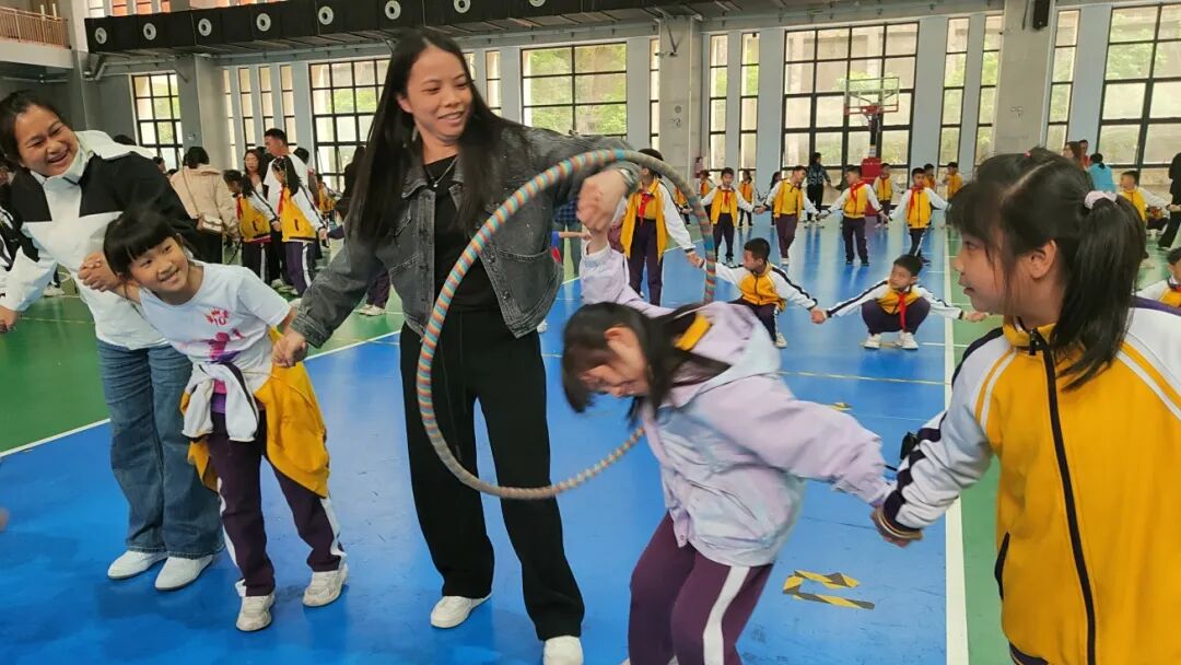 午后,学校运动馆化身为充满温情与欢笑的海洋。家长与孩子们并肩而立的画面,构成了最动人的风景。在众多趣味与竞技兼具的项目中,“呼啦圈接力赛”无疑成为了全场瞩目的焦点,将校家社协同的精髓展现得淋漓尽致。
