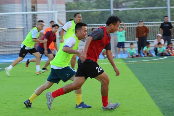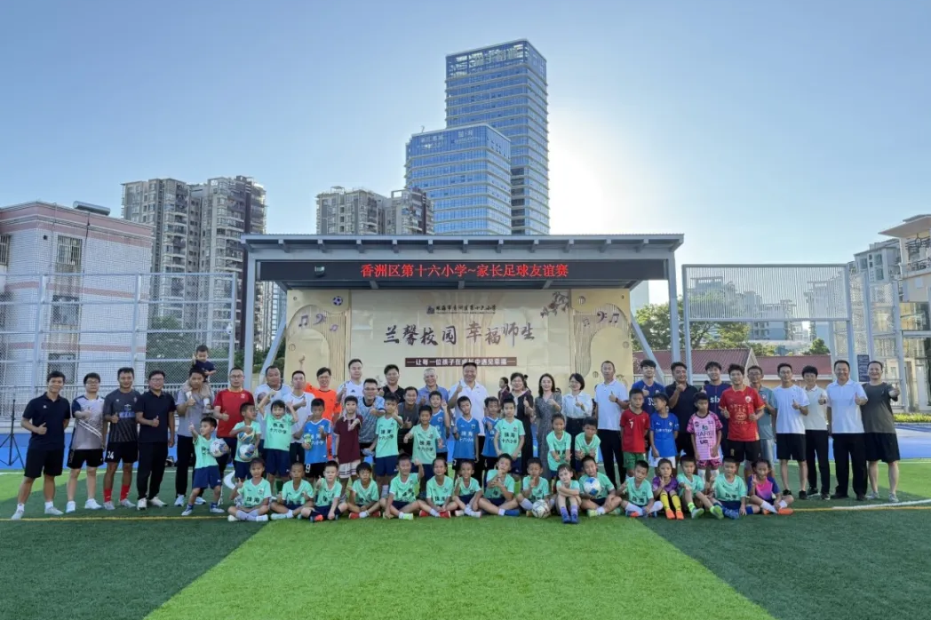 香洲区第十六小学在新建足球场举办教职工与家长足球队交流赛。比赛分上下半场,教职工队与家长队攻防交替,观赛家长和孩子现场助威。